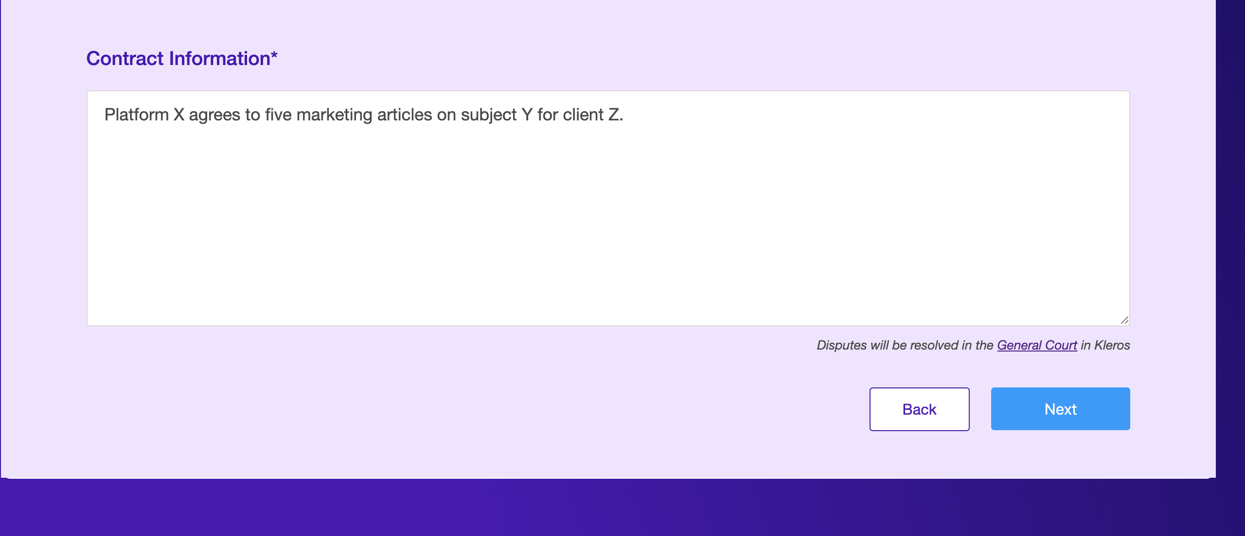 Here, we see a simple template example of contract information. This can be as long or short as your use case requires. All of the information inputted into this section would be sent to jurors should a dispute arise.