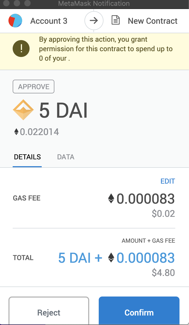 Finally click 'Next' and Metamask will open up with the transaction details to be paid into the escrow smart contract. In this case, we've made a small 5 DAI payment which will be deposited into the escrow once confirmed.