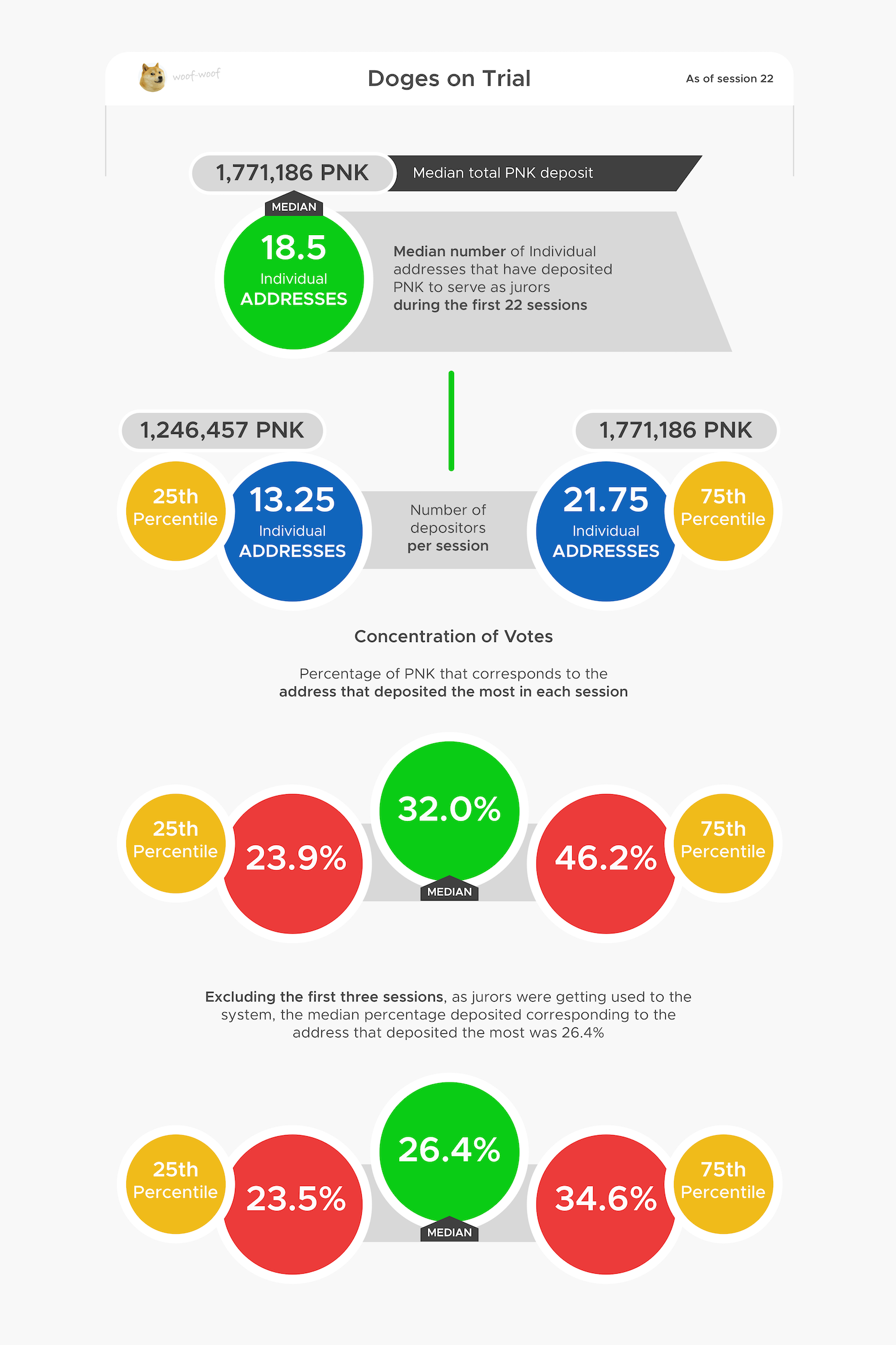 The median number of individual addresses that have deposited PNK to serve as jurors during the first 22 sessions of the Doge Pilot has been 18.5; the 25th and 75th percentiles for the number of depositors per session were 13.25 and 21.75 respectively.