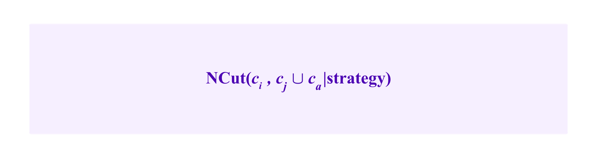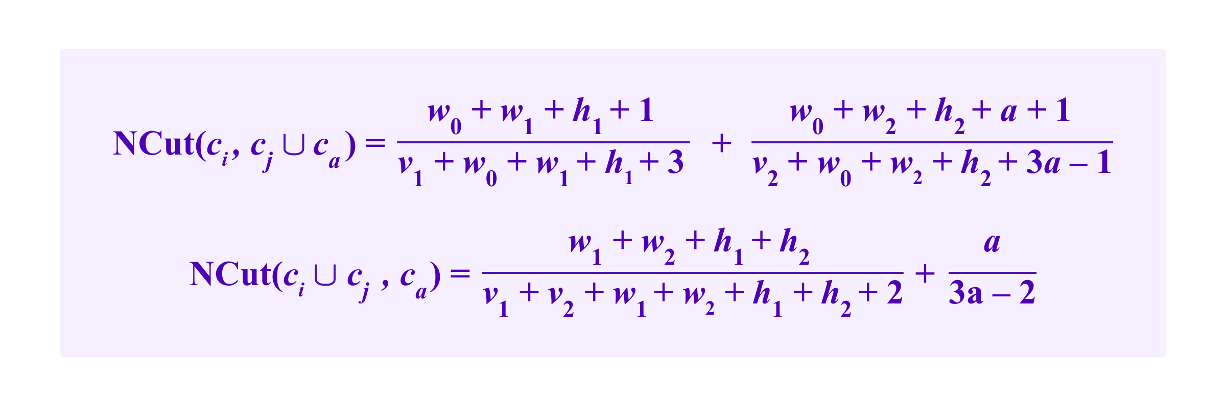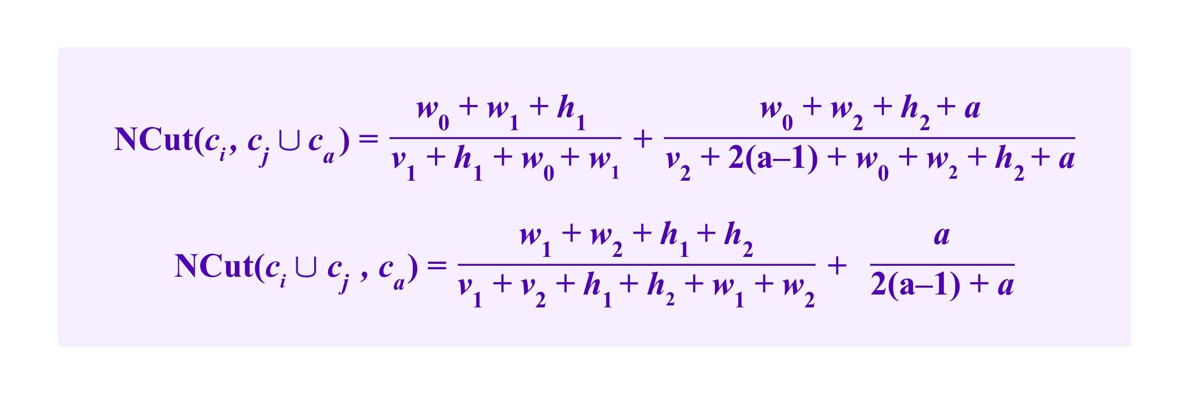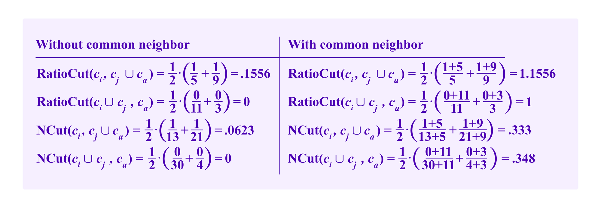 Heuristically, we suppose that the common neighbor winds up in some other cluster than ci, cj, or ca so that we don't have to account for its role in its own cluster. Then, with the notation above, this gives us a formula for NCut of: