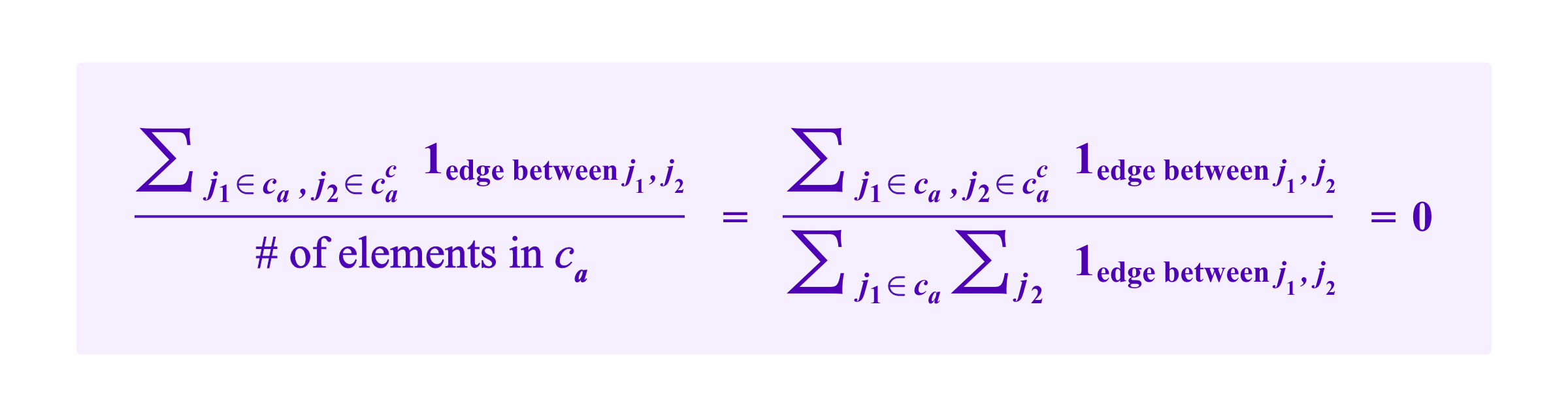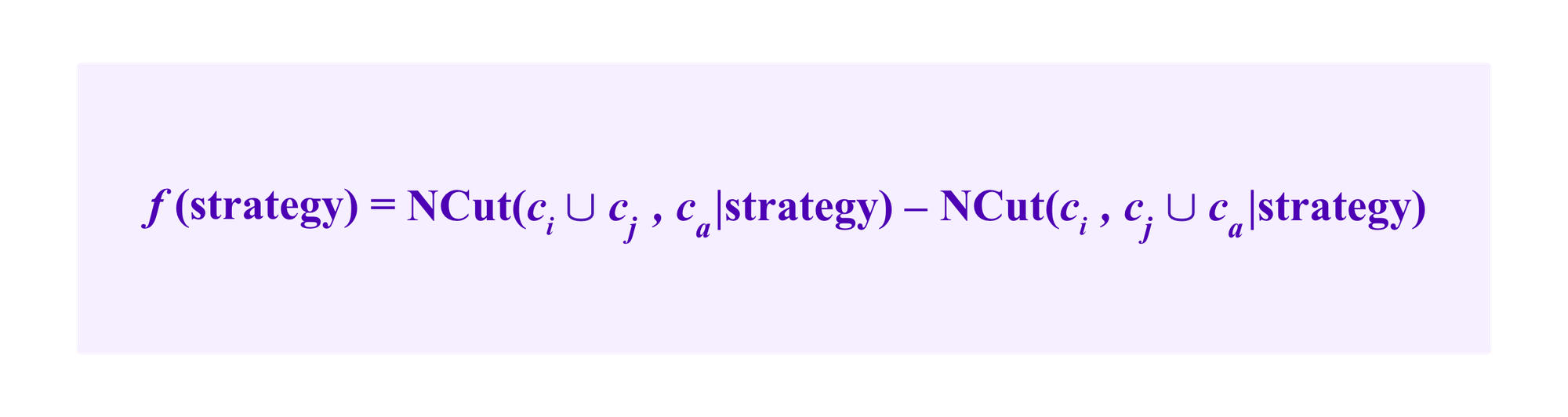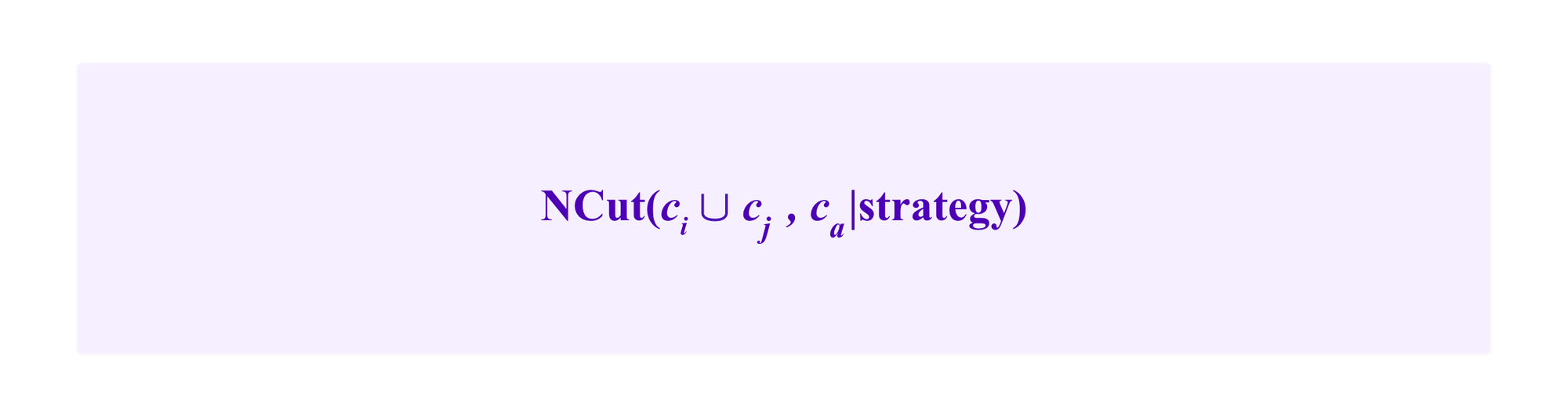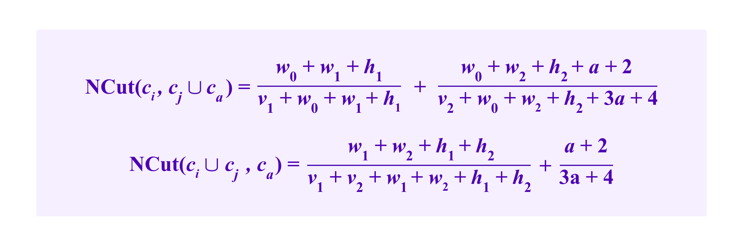Heuristically, we suppose that the common neighbor winds up in some other cluster than ci, cj, or ca so that we don't have to account for its role in its own cluster. Then, with the notation above, this gives us a formula for NCut of: