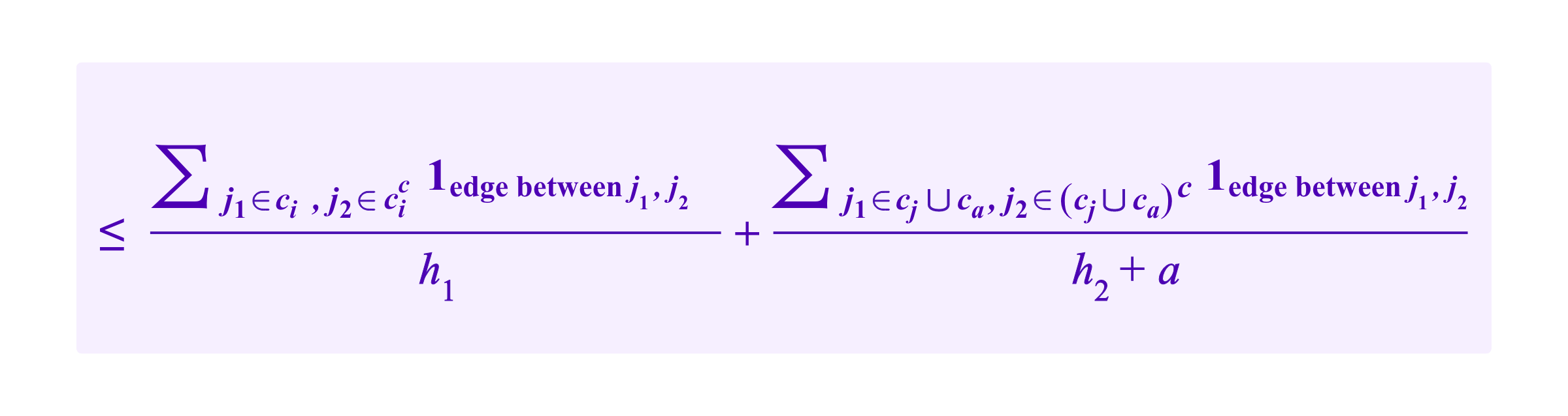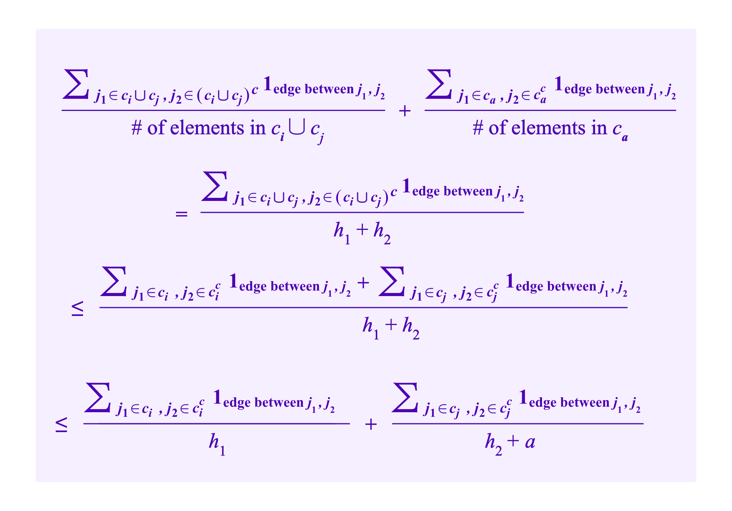 where the second to last line holds as long as a<= h1, which the attacker can arrange her Sybil identities to achieve. So, the two terms from taking clusters ci and cj combined and ca separate contribute less to RatioCut than taking clusters ci separate and cj and ca combined.