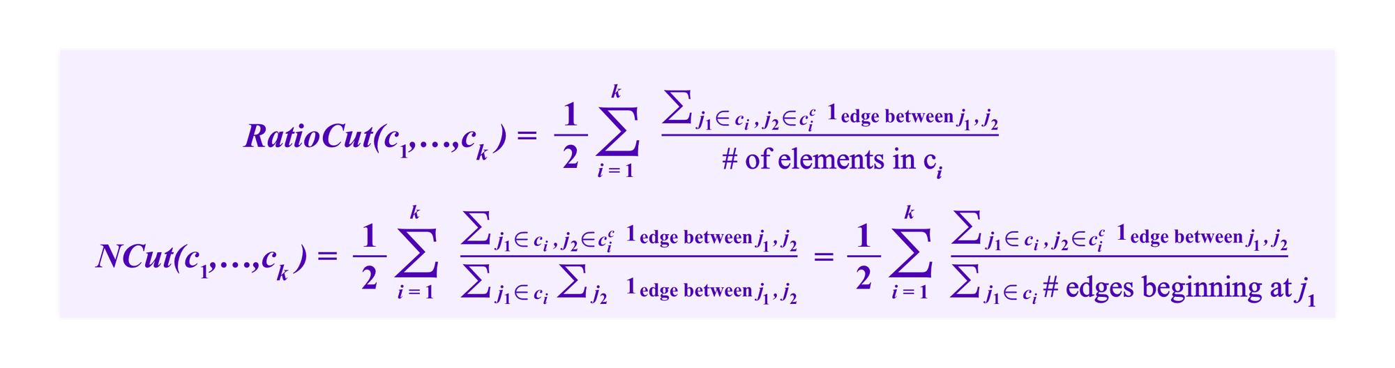 Here the terms in the denominator correspond to notions of size of the clusters, the number of elements in each cluster for RatioCut and the number of edges beginning in that cluster for NCut, so that the terms for a small cluster are made larger.