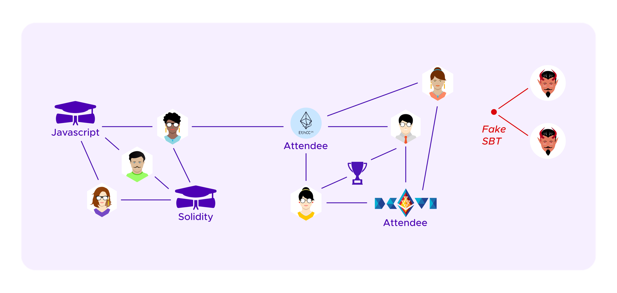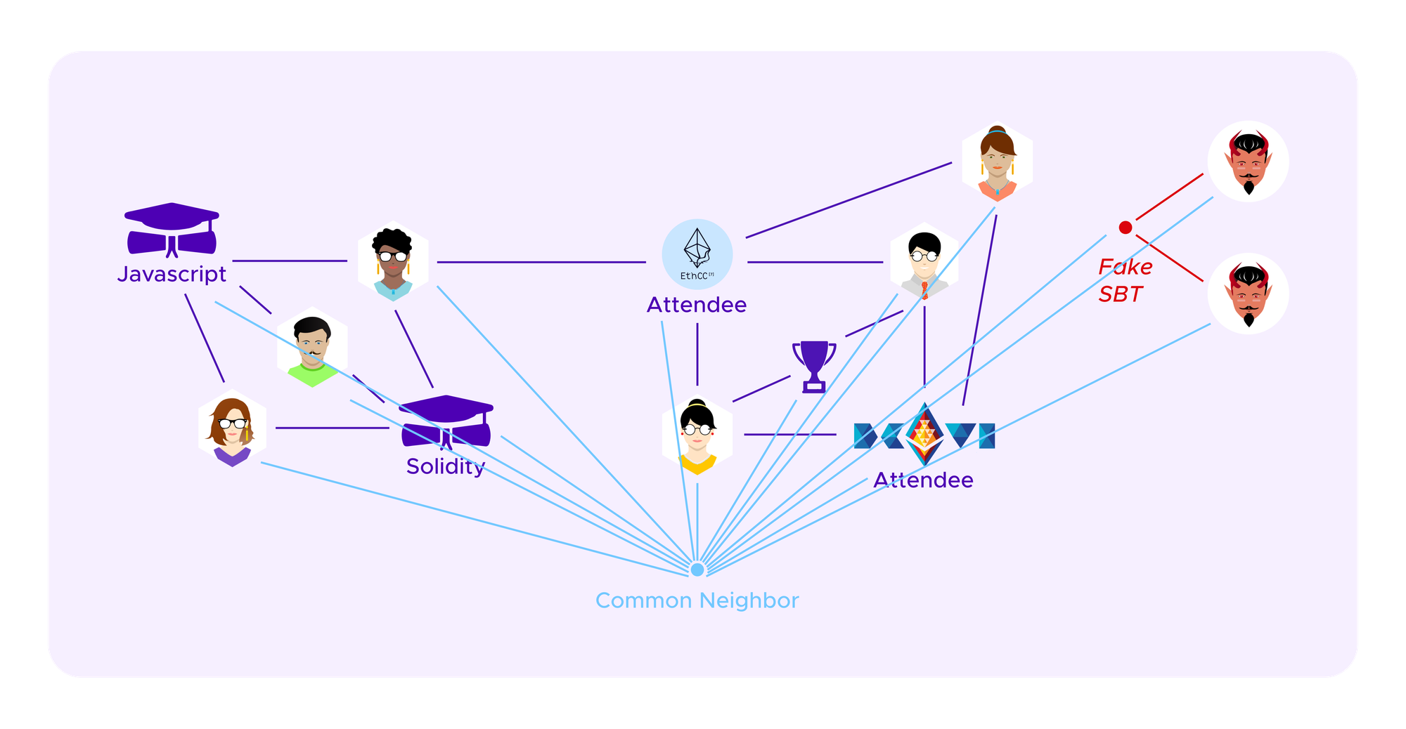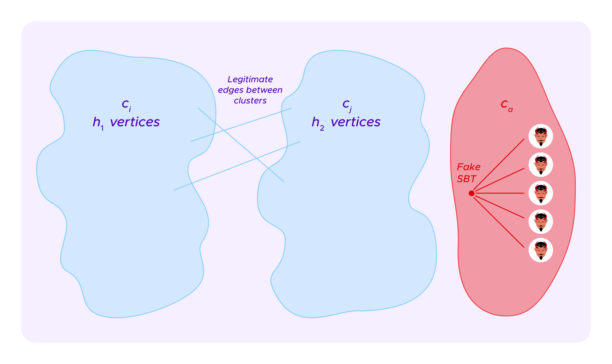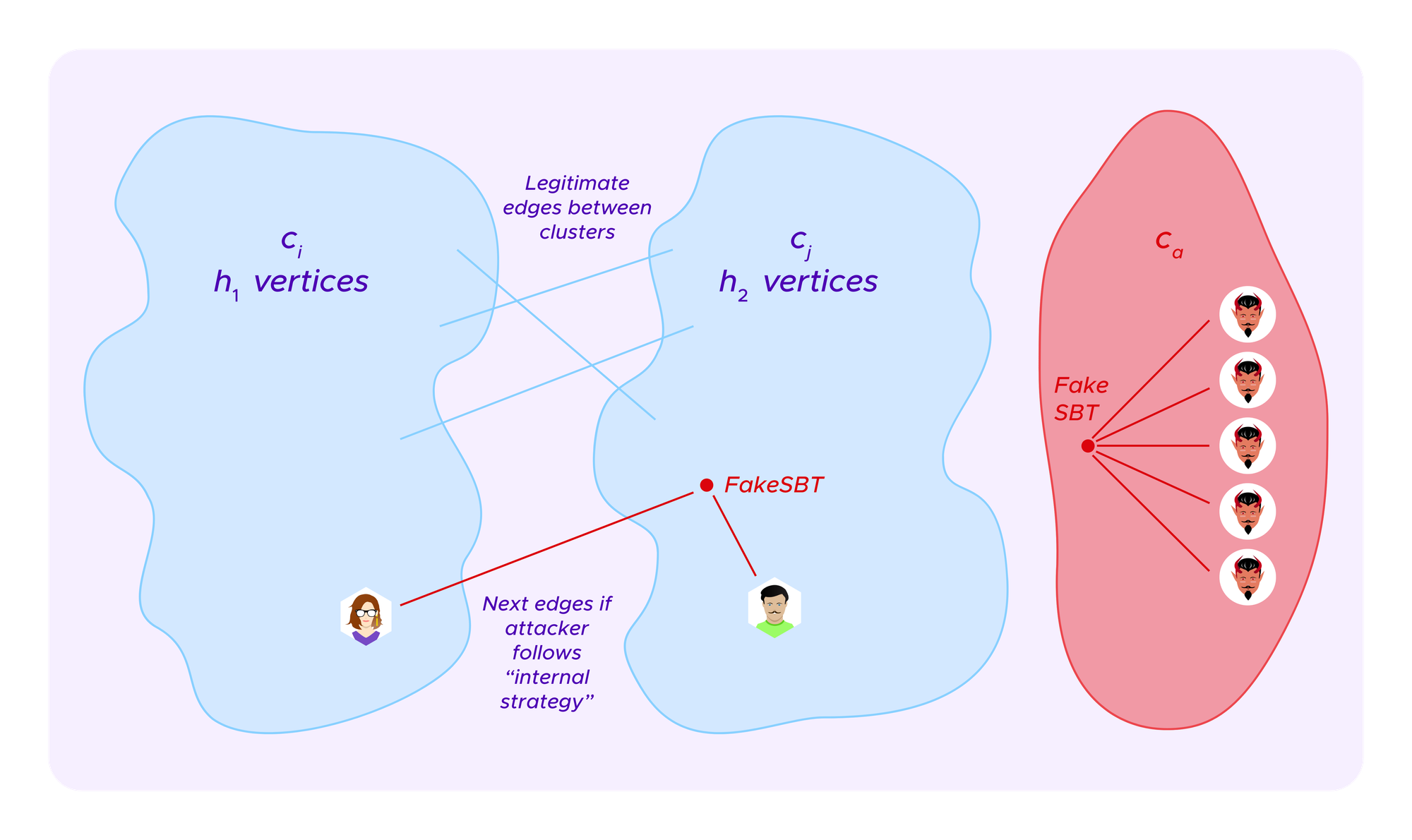 - External attack - The attacker can attribute a fake SBT to her Sybil profiles. The idea here is that this collection of Sybil profiles, which seem similar as they all have the fake SBT, can break off and form a new cluster.