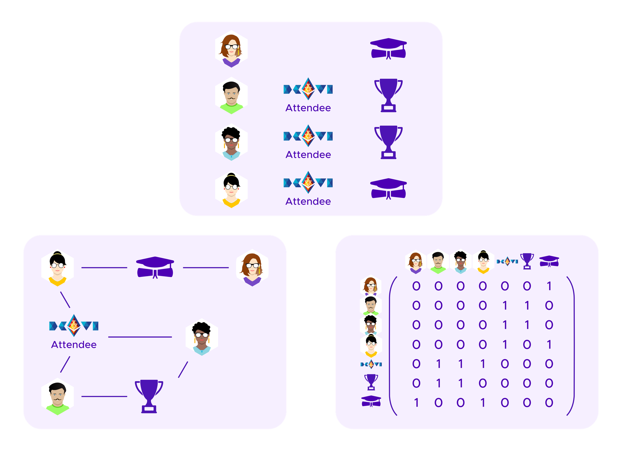 One starts by creating a graph that represents which users have connections to each other, in this case which users have which SBTs. This can then be encoded in a symmetric matrix where there is a 1 in entries corresponding to where a given user has a given SBT and 0 otherwise. Note that, in our application, this is a bipartite graph as edges only ever connect users and SBTs. One does not have edges between two users or between two SBTs.