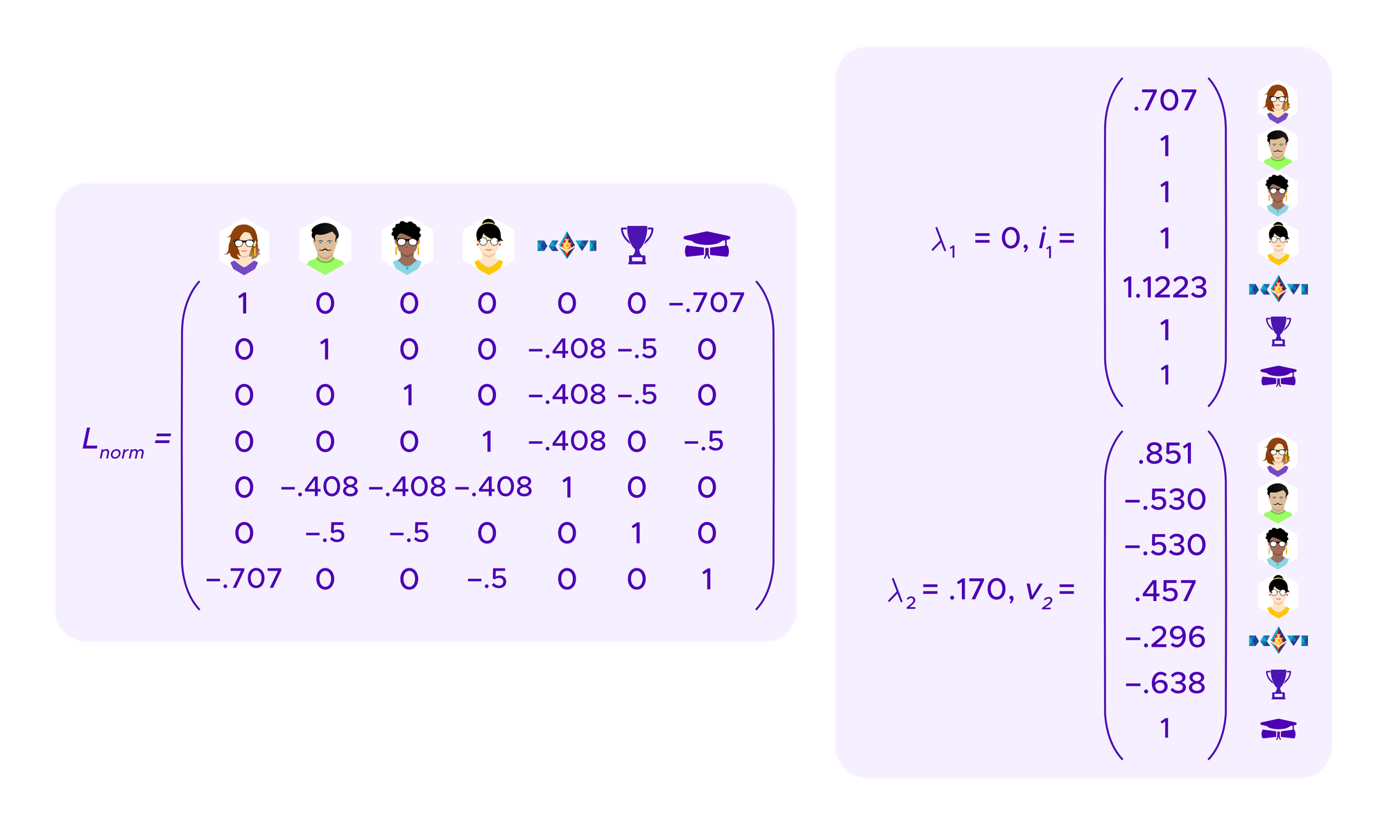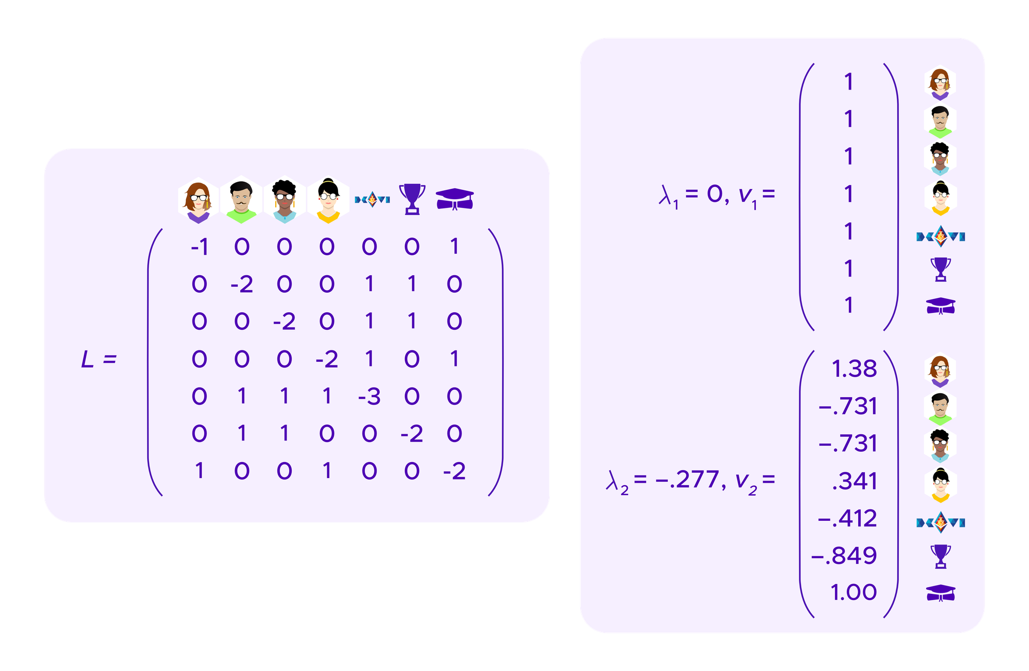 The graph Laplacian is a matrix that is derived from the matrix above that encodes the information about who holds what SBT. One can show that its eigenvectors give information about the clusters of the graph.