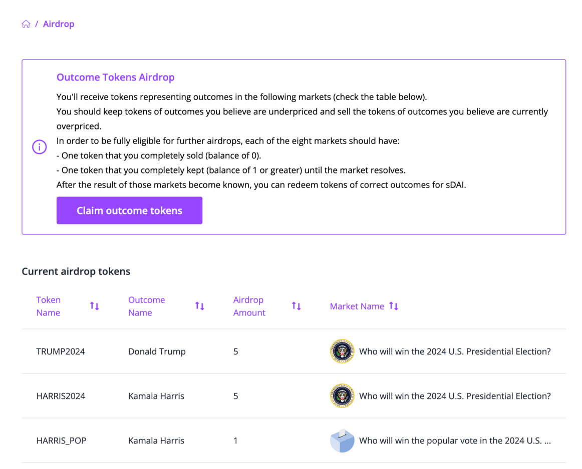 Every eligible user will receive 10 sDAI worth of outcome tokens across a range of election markets, including: