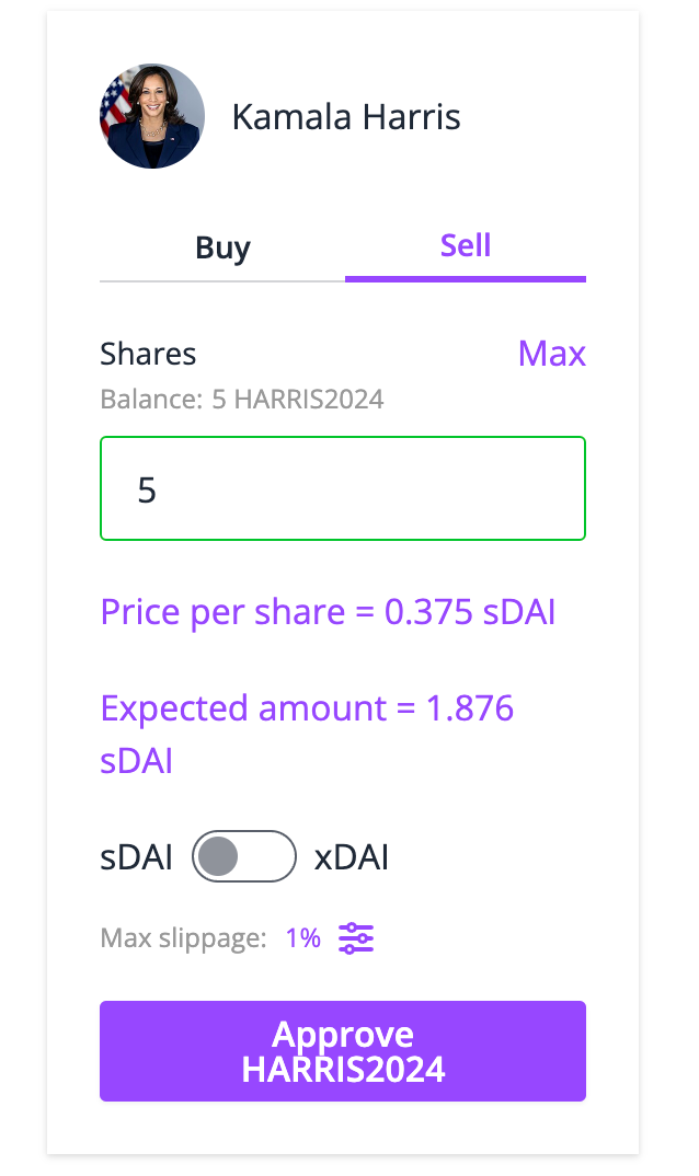 - Sell the tokens of the outcome you think is overvalued. (If you believe Harris is more likely to win, sell the Trump tokens, and vice versa.)