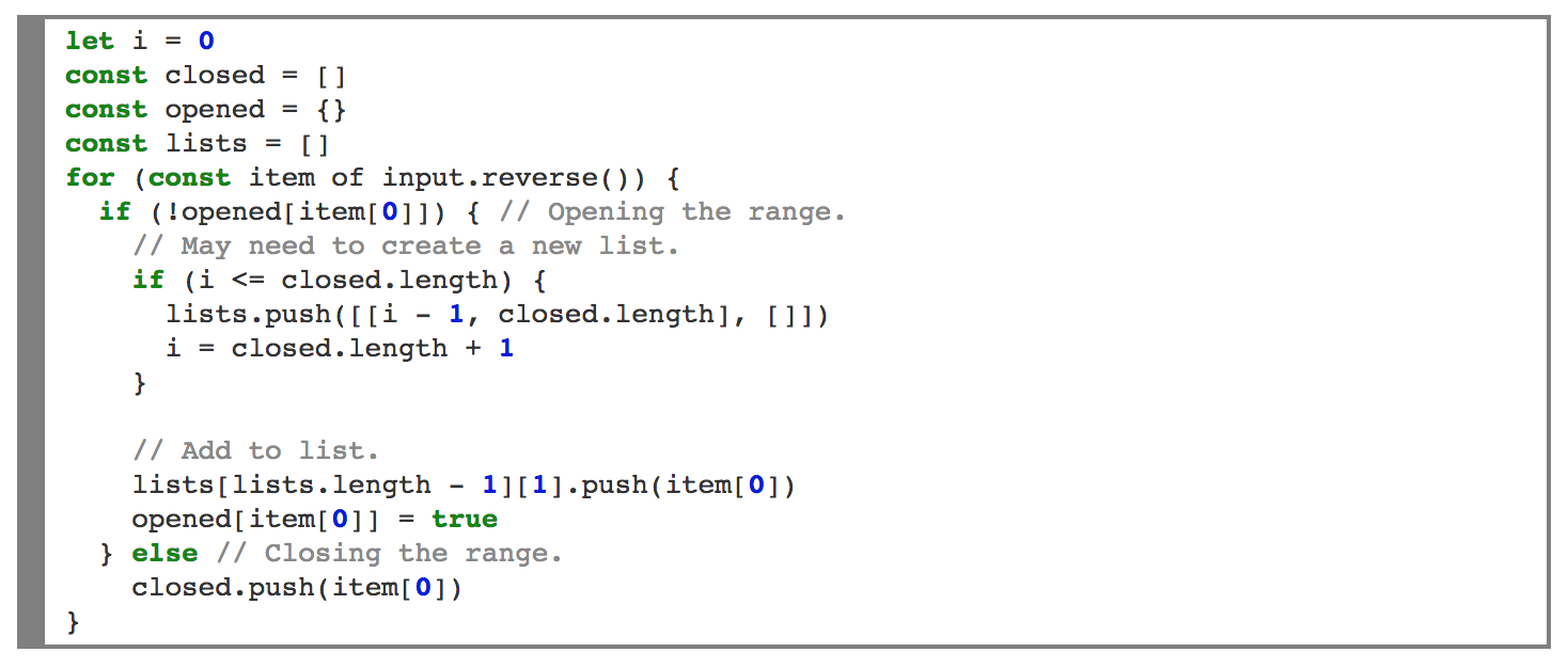 We ran some preliminary tests to see if this algorithm works on various combinations of ranges and it appears to be sound and complete, but we were still worried that building the tree would be too computationally complex to do on-chain. So I pulled out a little REPL and started playing around to see if I could get it down to at least O(n) complexity, and I did. If you require range endpoints to be inserted into an input list in order, always breaking ties with an opening endpoint rather than a closing one, like so: