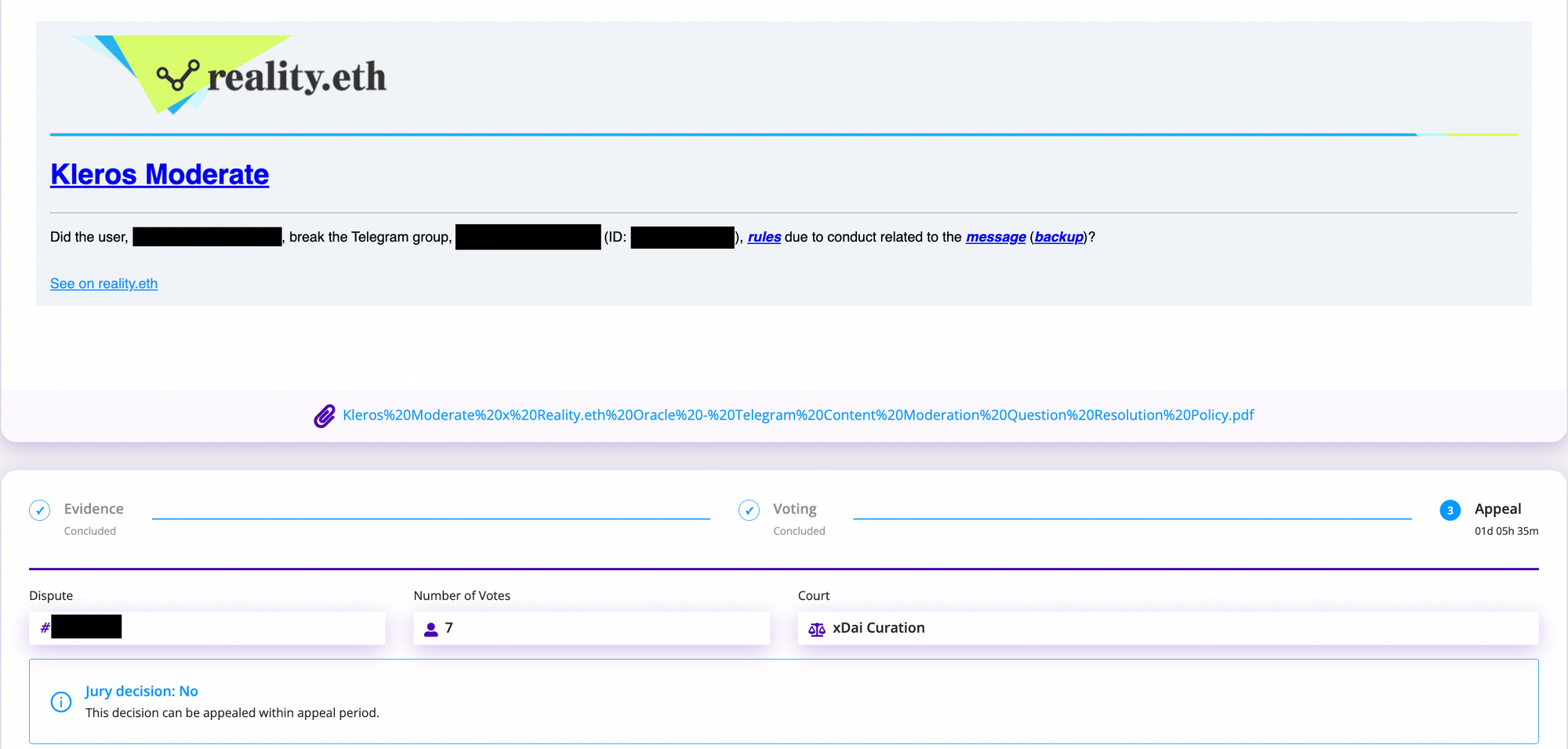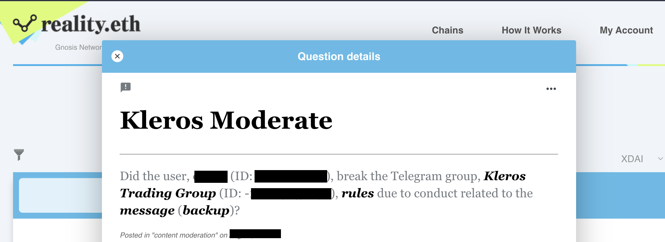 As seen above, the user's message is saved on IPFS to prevent the user from deleting evidence and a question is posed on reality.eth on Gnosis Chain. A minimum bond is then set (in this case 1 DAI) to give an answer to the question.