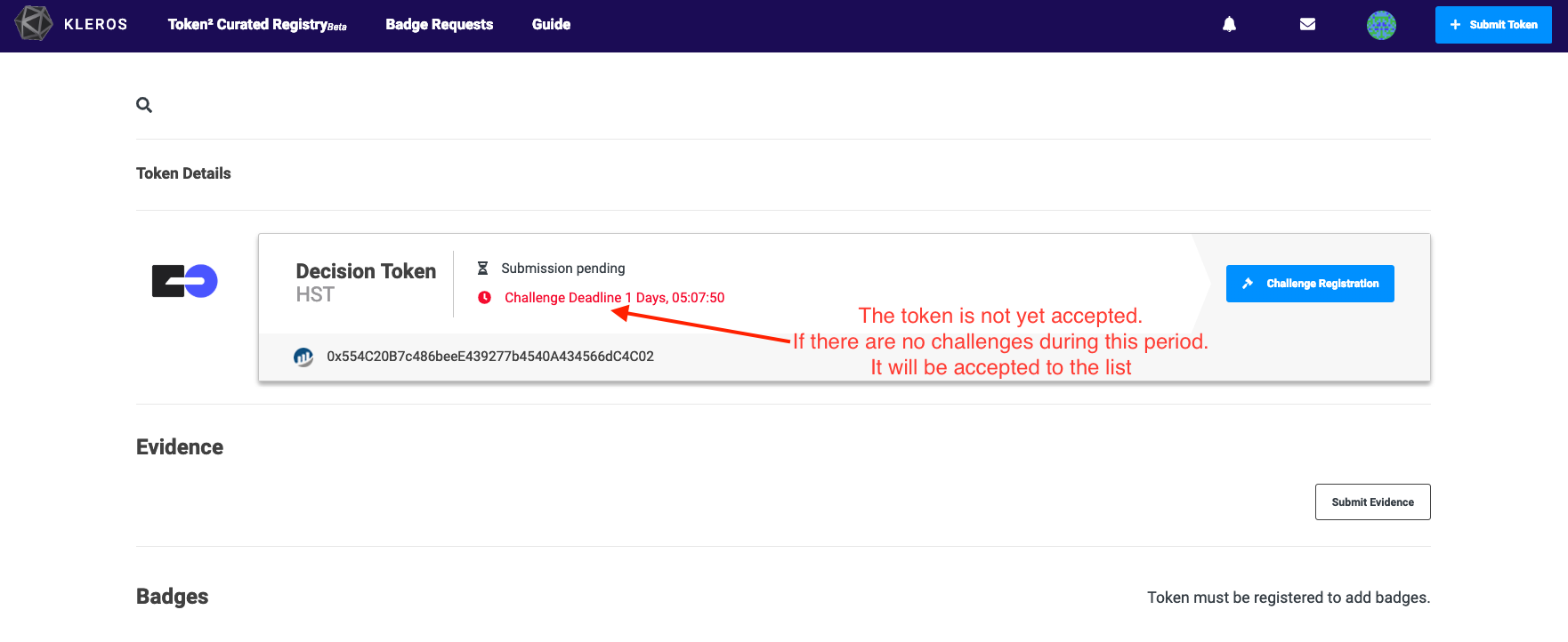 Upon clicking on your submission you will see the info displayed below including the challenge period. This is the time allotted for other users to challenge the listing in the case of incorrect data or logo format.