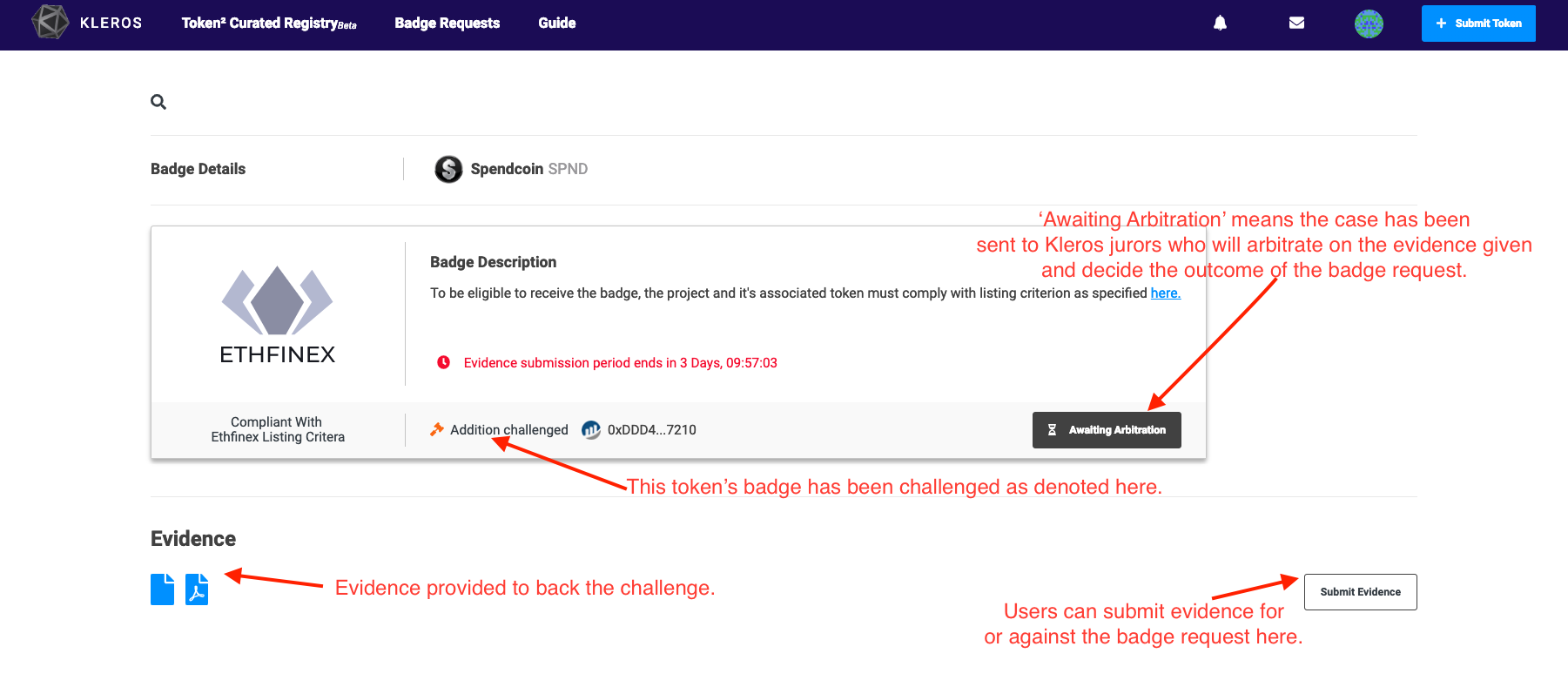 Clicking on a challenged badge will show the information below. Here, users can upload evidence which will be sent to Kleros jurors.