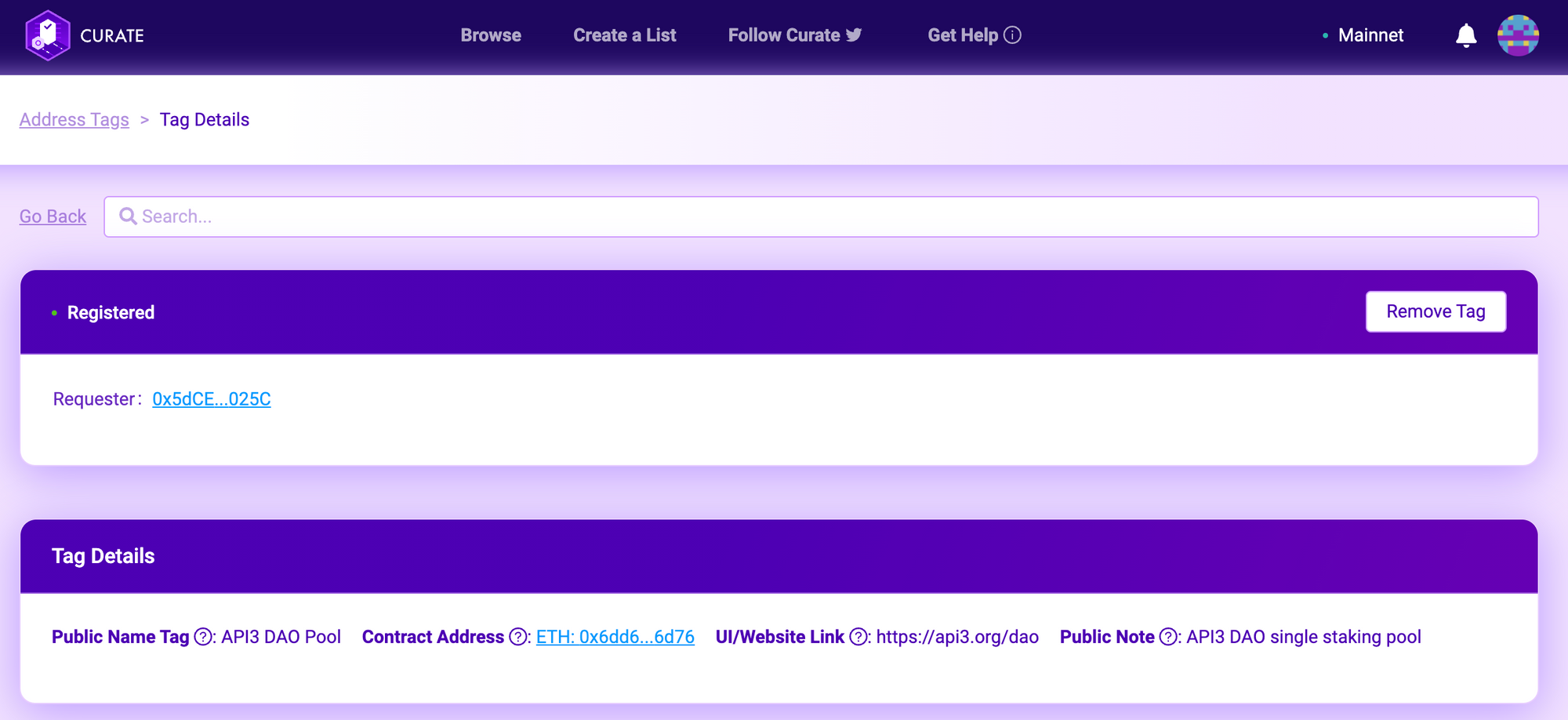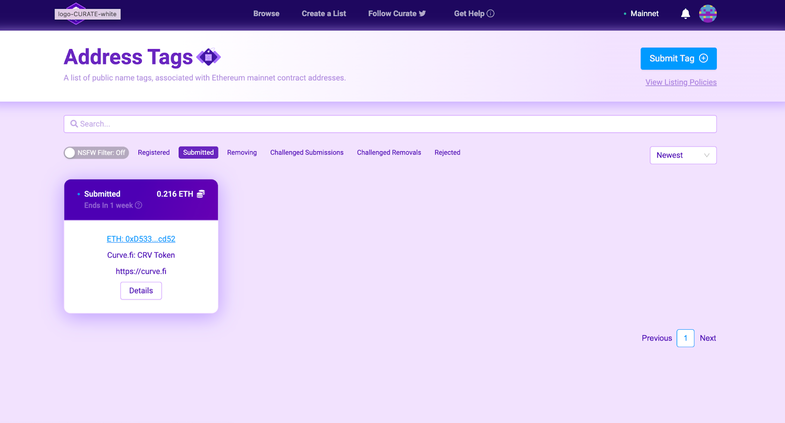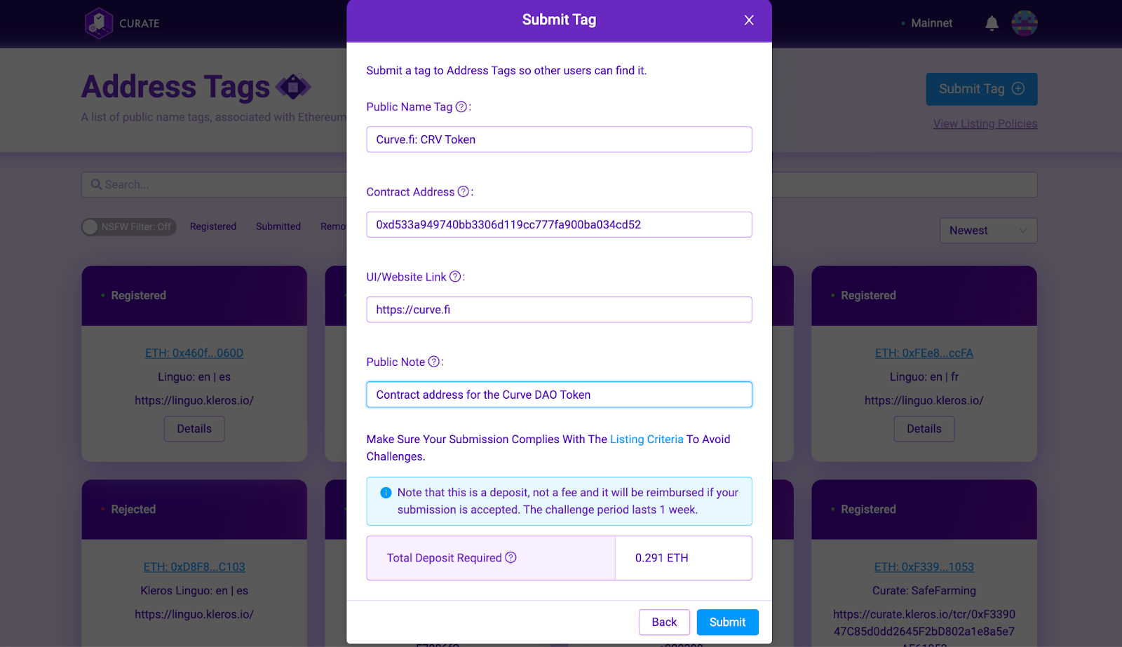 3. Once you have reviewed the listing policy document of the registry, click on 'Submit Tag' and fill in the form with the required information. In your wallet (e.g. Metamask), perform the transaction to submit the request and post the applicable deposit (will be refunded if the entry is successfully accepted).