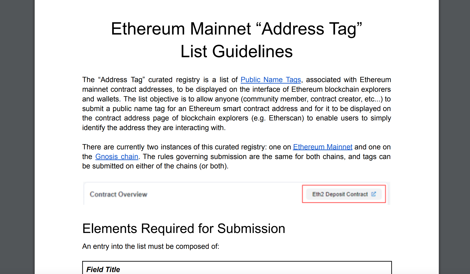 You can find the detailed steps below, in which we reference Etherscan’s interface to show how a tag can be submitted and made visible on a blockchain explorer using this registry.
