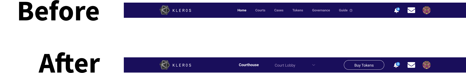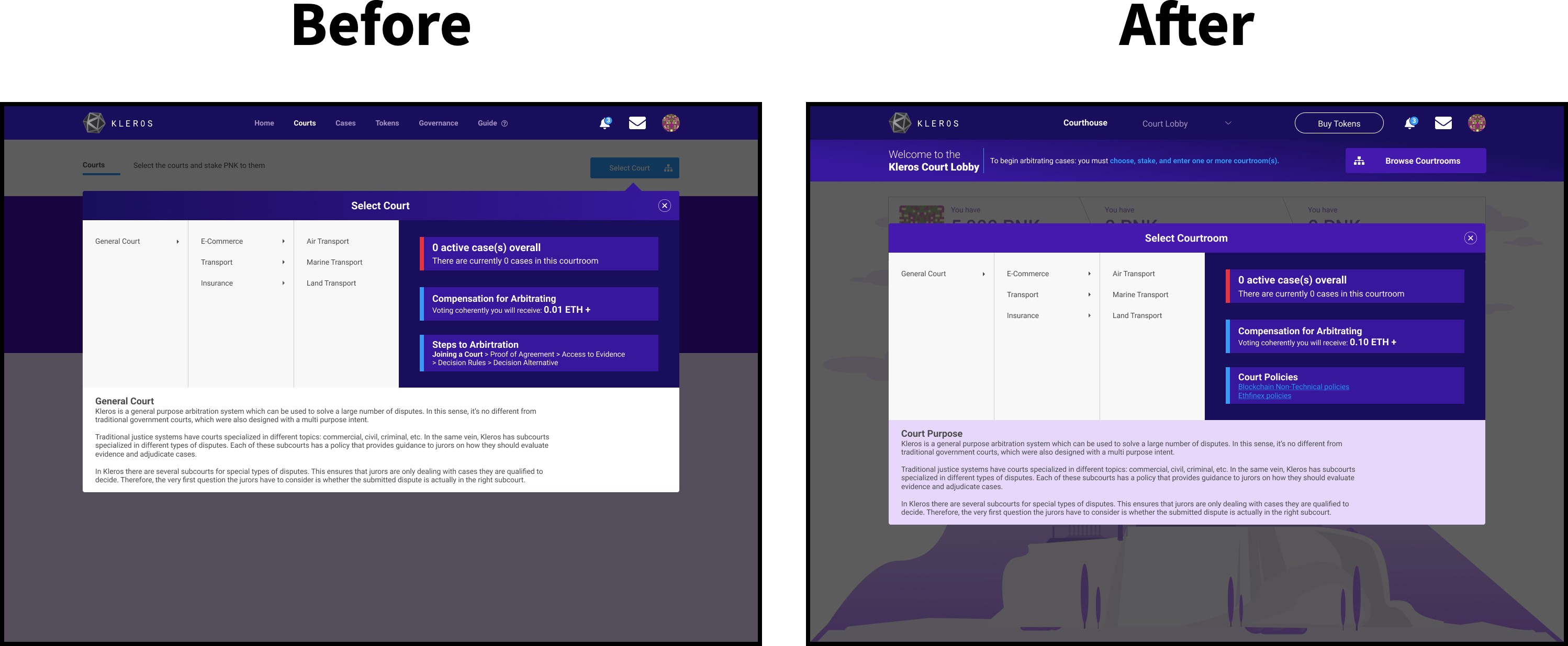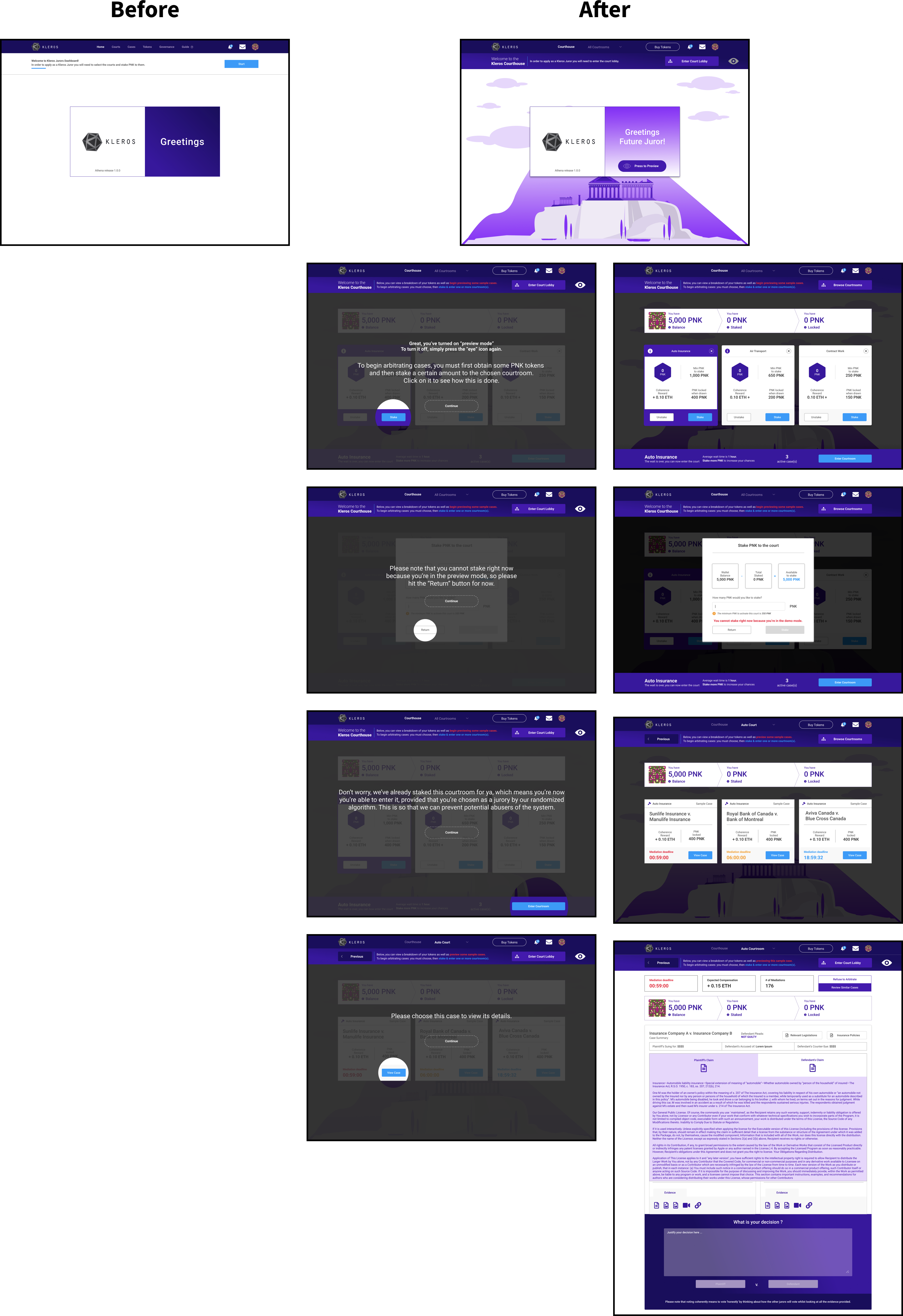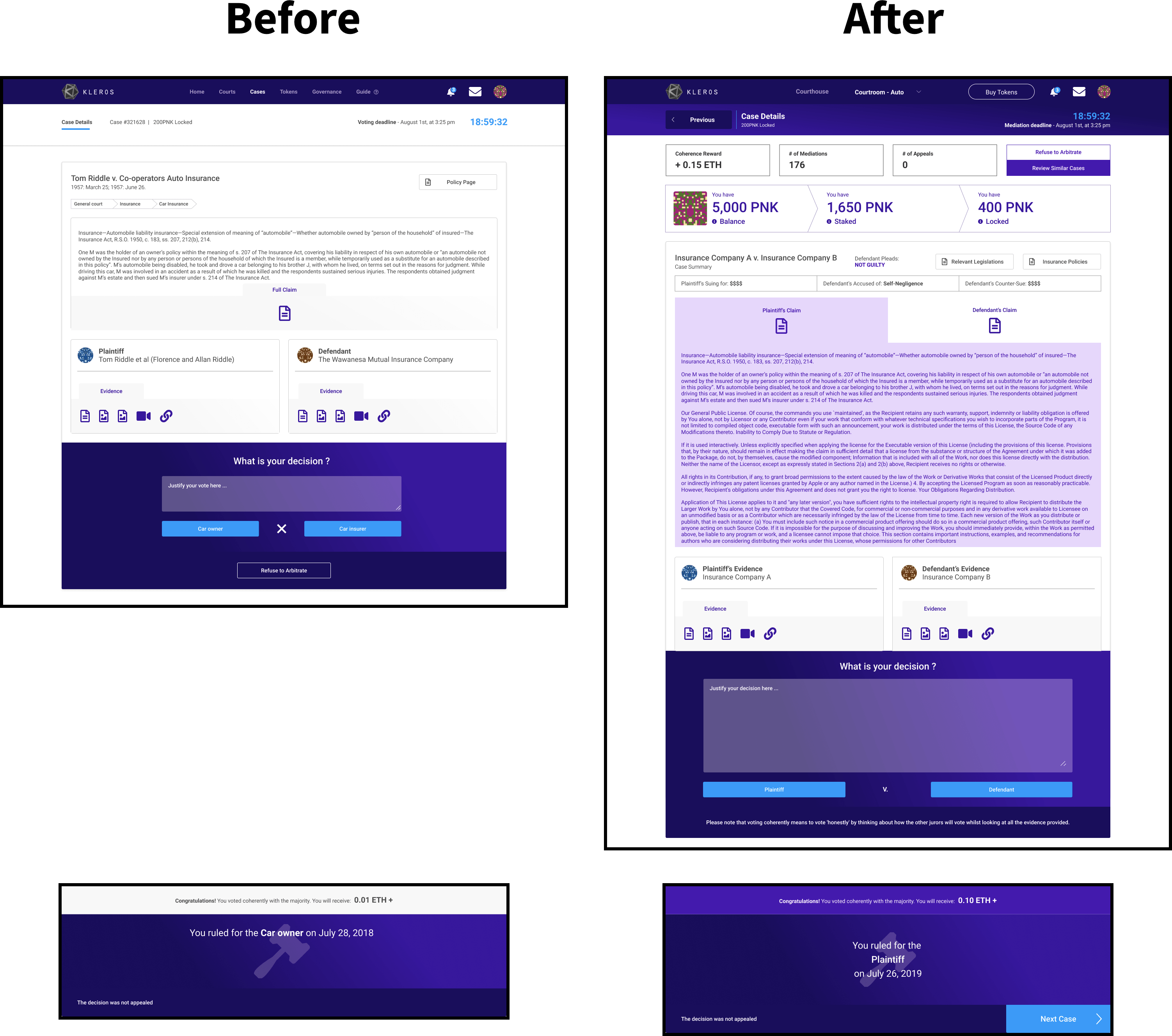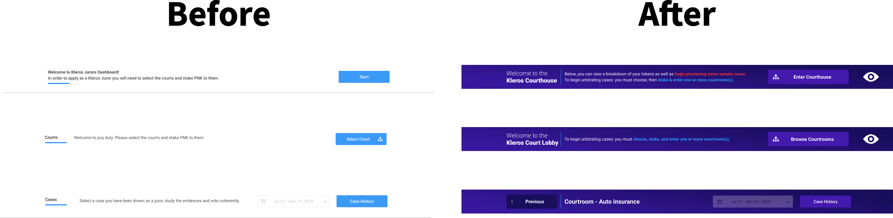 Apart from integrating the aforementioned UI elements of the Subnav, Swimlane, and Courtroom Cards, I introduced the bottom Action-Bar as a way to address the overall in-series UX of Kleros. Visually, it also makes it look like a house given that the user is now within the Courthouse — with a top and bottom enclosing the user in. This makes them feel safe, secure, and have confidence to know where to go next. The other key thing to note here is that at any given time a Courtroom Card will be automatically selected as default because previously this wasn’t the case.