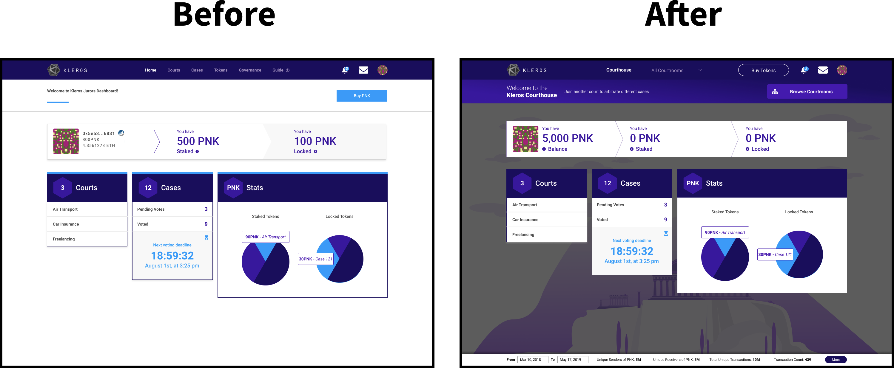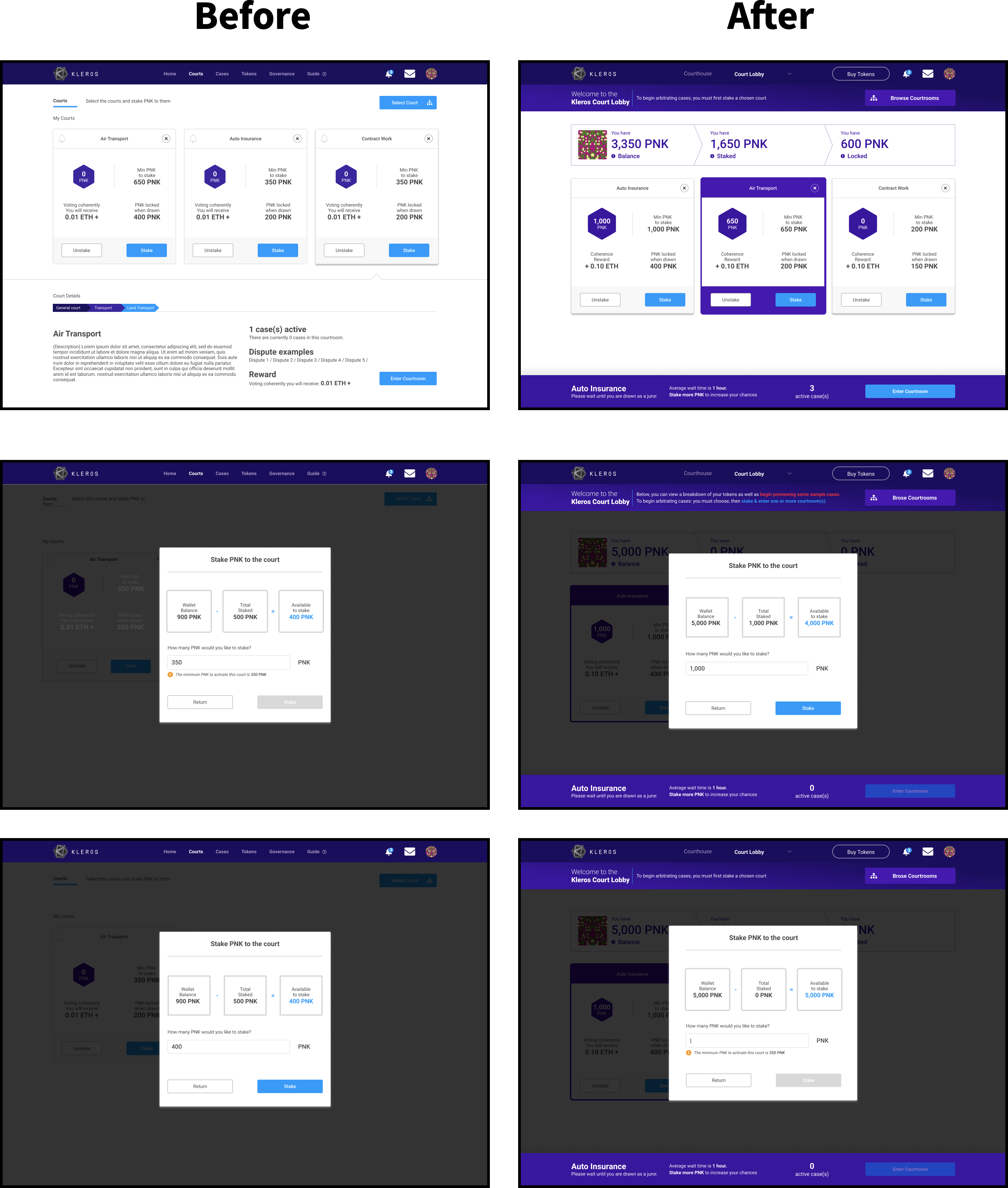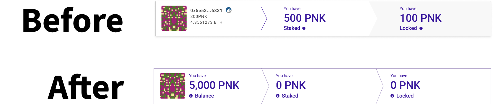 - Drastically and dramatically improve the PNK staking procedures for the courtrooms. How might we better motivate users to stake PNK into existing courtrooms given that this still might feel a bit like gambling? At the very least how might we better inform users as to what staked and locked mean?