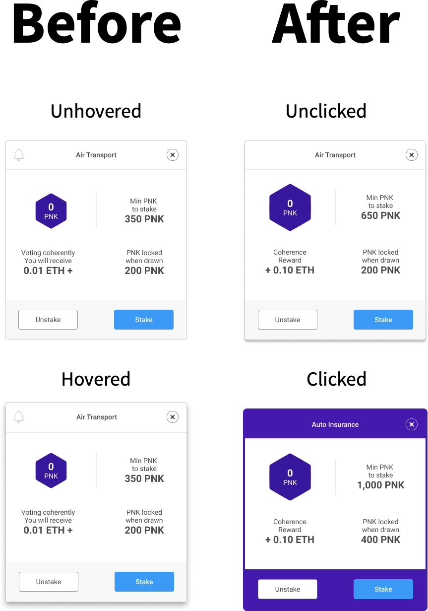 This is a crucial element and will stay consistent throughout most pages so as to keep the users constantly updated as to their PNK count. Visibility of System Status is the reigning design principle that I’m adhering to for this. It provides a visual reminder at all times how much they own, stake, and the amount locked, since Kleros has redesigned the legal practice of arbitration to become a transactional activity.
