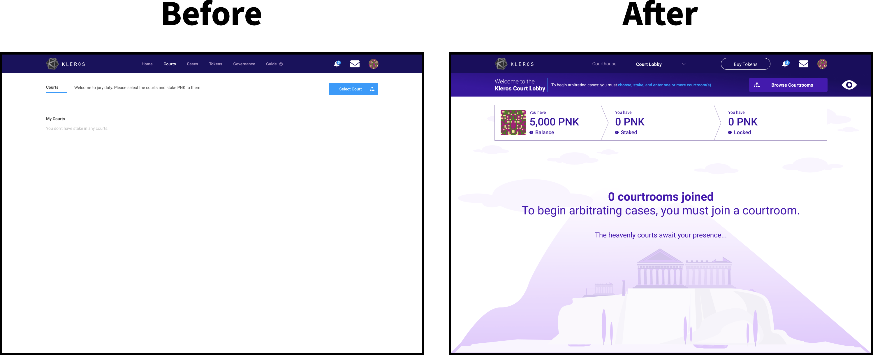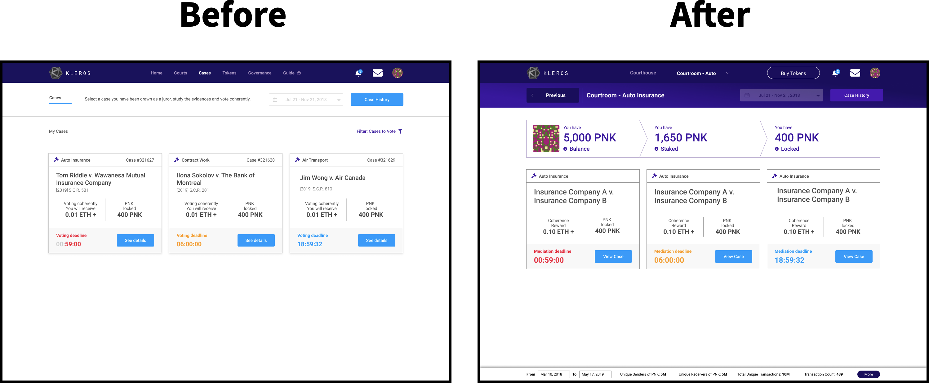“Cases” was confusing given that users are required to stake their courtrooms first before entering it to view them. Having separate tabs for “Cases” and “Courtrooms” didn’t make sense because it broke the information architecture of it all.