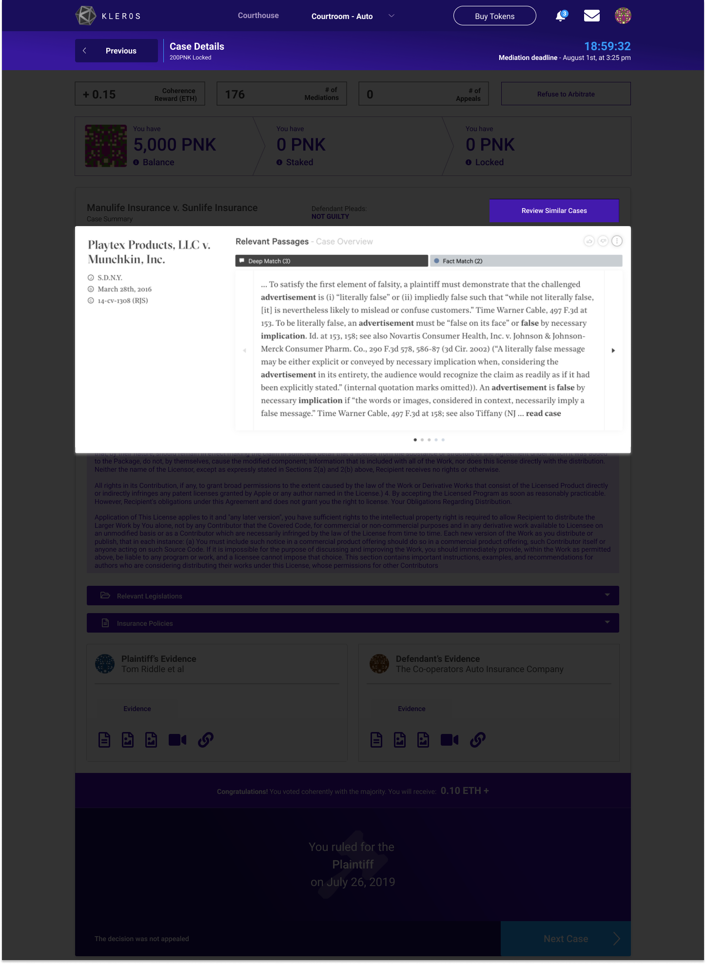 This is why I argued for using AI as an assisting force and integrative tool earlier when I mentioned Ross Intelligence (a CApp that is all about providing legal assistance to lawyers). The way that Kleros can go about doing this from a near-future state perspective is perhaps to have the following design for their case details page (with relevant legal documentation that is AI-analyzed):
