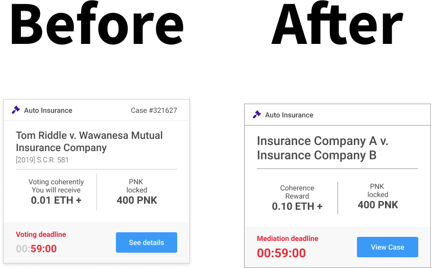 I removed the case numbers because that denotes judged cases not arbitrating cases. I increased the ETH count because 0.01 was demotivating. I spruced up the visual design a bit to adhere to my grid as well as removed all real world names so as to adhere to the bias-free design principle.