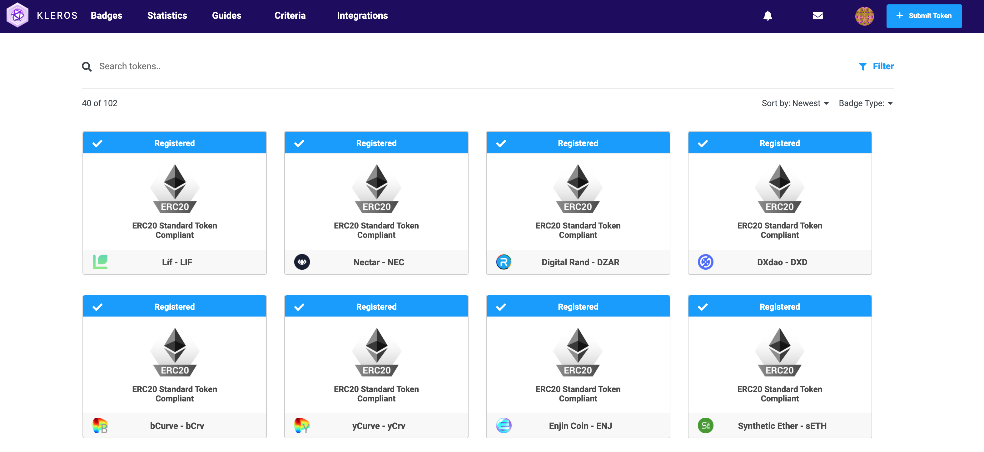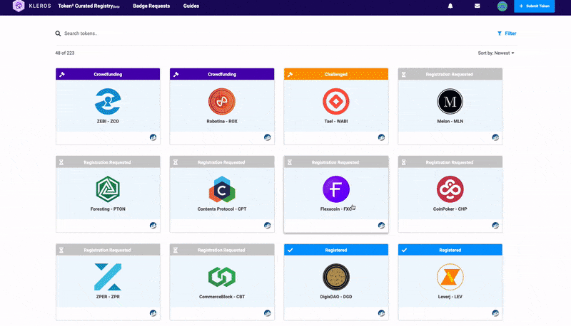 Head on over to tokens.kleros.io and you'll be presented with a list of submitted tokens in various states. Some will be pending, others challenged and most accepted.