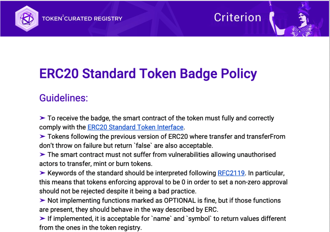 For example, the ERC20 badge, when accepted, gives users peace of mind that the token conforms to a proper ERC20 standard. This can help to avoid failed transfers or lost funds from improper development practices.