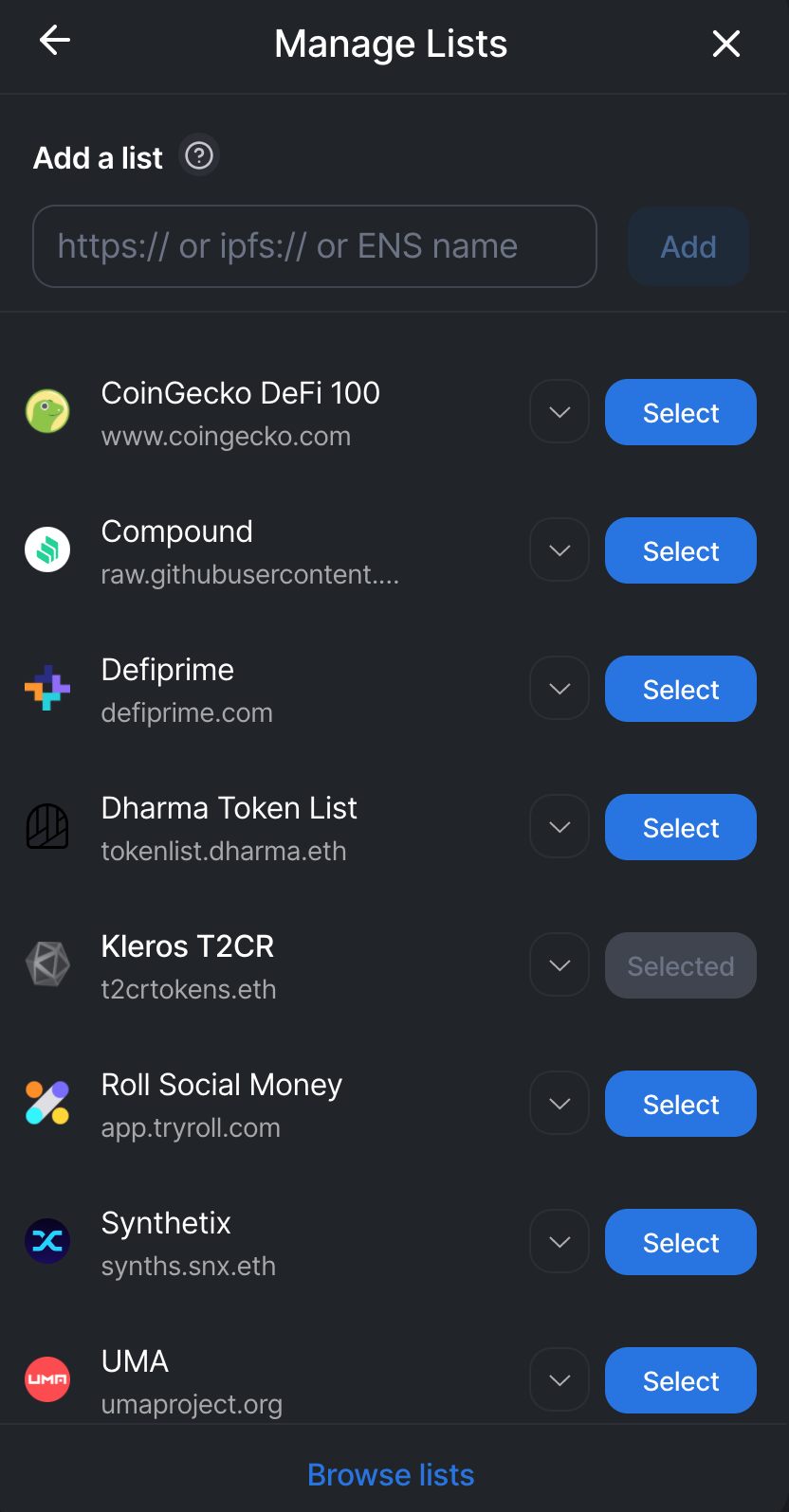 Setting up Kleros as your Uniswap lists tool is extremely simple. When first landing on Uniswap you'll be prompted to select a list.