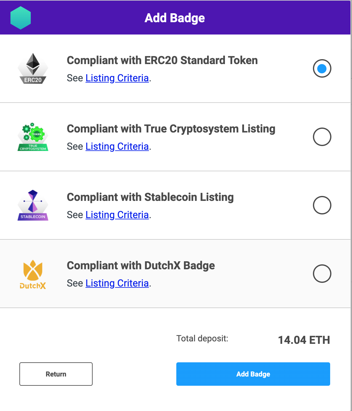 When you're 101% sure the token complies with the ERC20 standard click 'Add Badge' and pay the 14.04 ETH deposit.