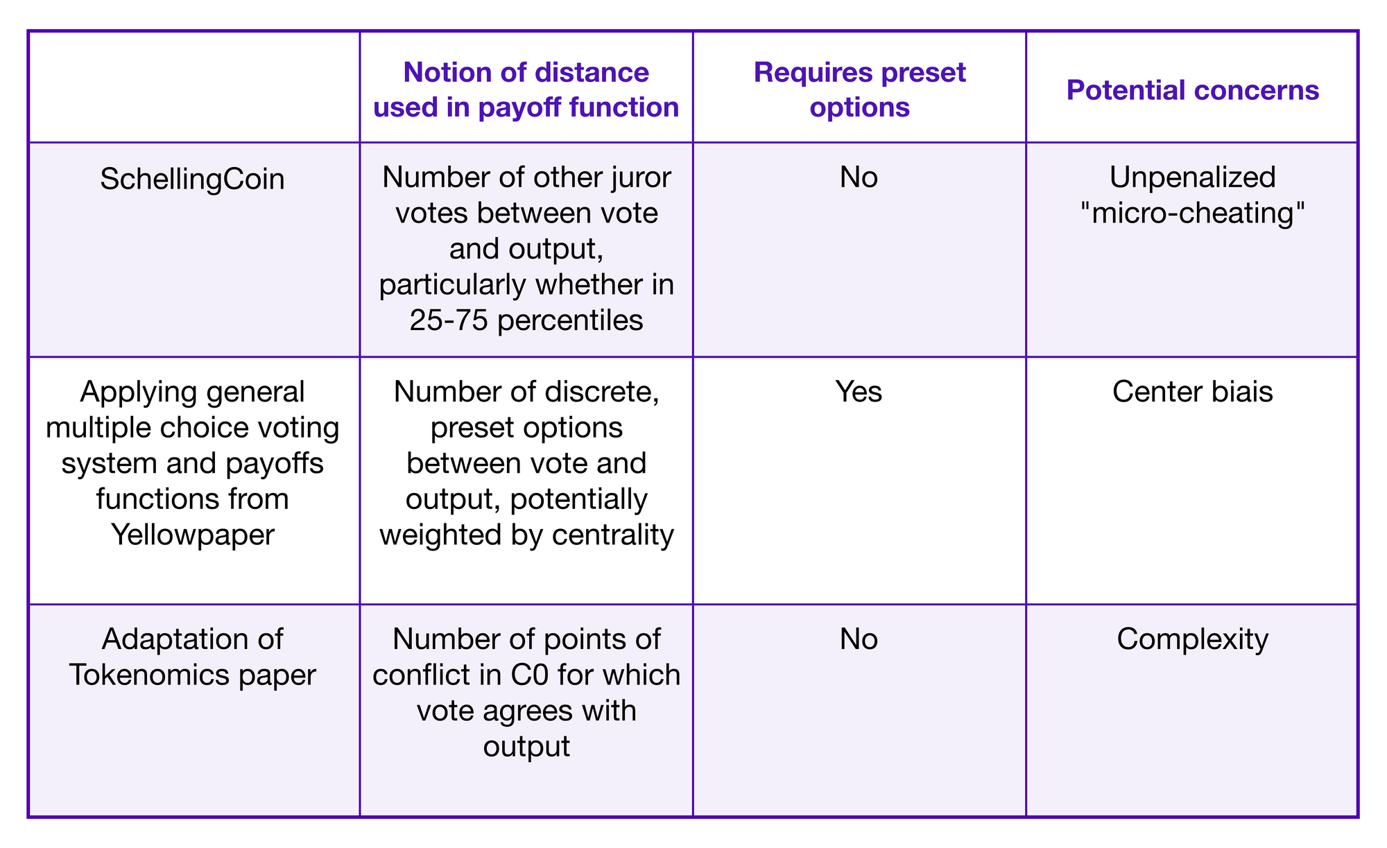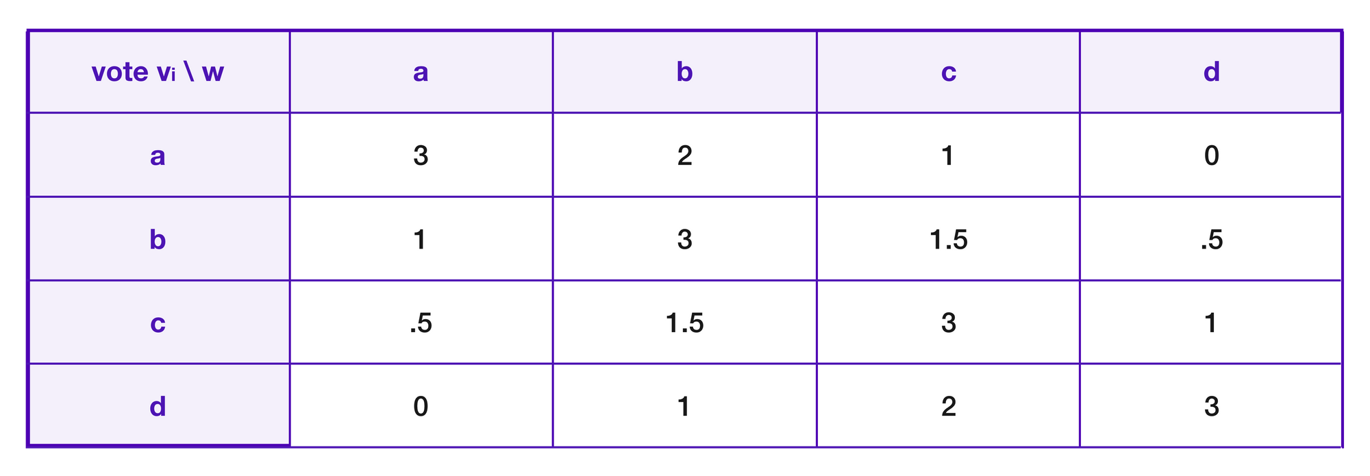 One of the voting systems drawn from social choice theory mentioned above can be used to determine a winning option w based on the submitted rankings. Then, a (somewhat simplified) example of the type of incentive system that we consider in the Yellowpaper would penalize a juror i who provides a vote of vi an amount of