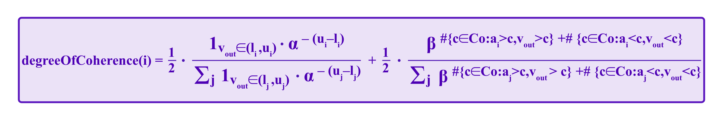 The idea here is that in degreeOfCoherence(i), the first term encourages a juror i to submit an interval (li,ui) that is short; the exponential alpha^{-(ui-li)} quickly decays as the length of the interval ui-li grows. However, the juror is also incentivized to not submit an interval that is so short that she risks vout falling outside of it as then she receives a contribution of zero from this term.