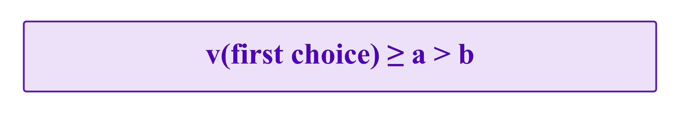 Then, suppose that three possible outcomes a, b, and c are such that a > b > c as numbers. The consistency properties that we assume on our voters are the following: If some voter thinks outcome a is a better outcome than outcome b, she also thinks that b is a better outcome than outcome c. Similarly, if a voter thinks outcome c is a better outcome than outcome b, she also thinks that outcome b is a better outcome than outcome a.