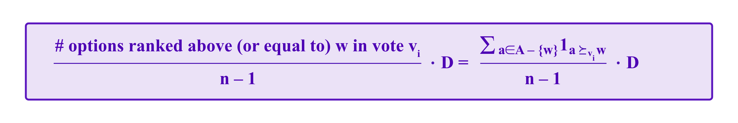 in the above formulas with values f(vi,w) that give one point to juror i for every option in A-{w} that i's vote implies (using the consistency properties) that she would rank behind w and gives a half-point to i for every option in A-{w} for which the consistency properties do not give information on how i would compare that option to w.