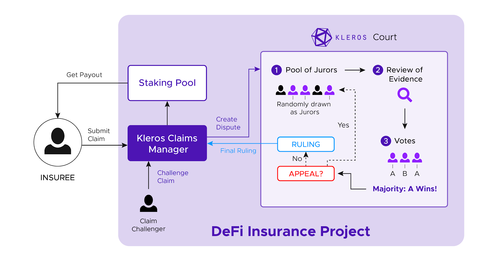 Kleros courts can be easily built into any DeFi holdings coverage set of contracts by integrating an arbitrable Claim management contract that will manage the claim and the challenge process.